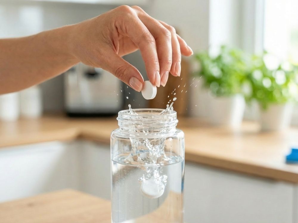 2. Wrzuć: Dodaj 1 tabletkę Zenevo i obserwuj proces musowania. (1 tabletka na każde 250ml wody)