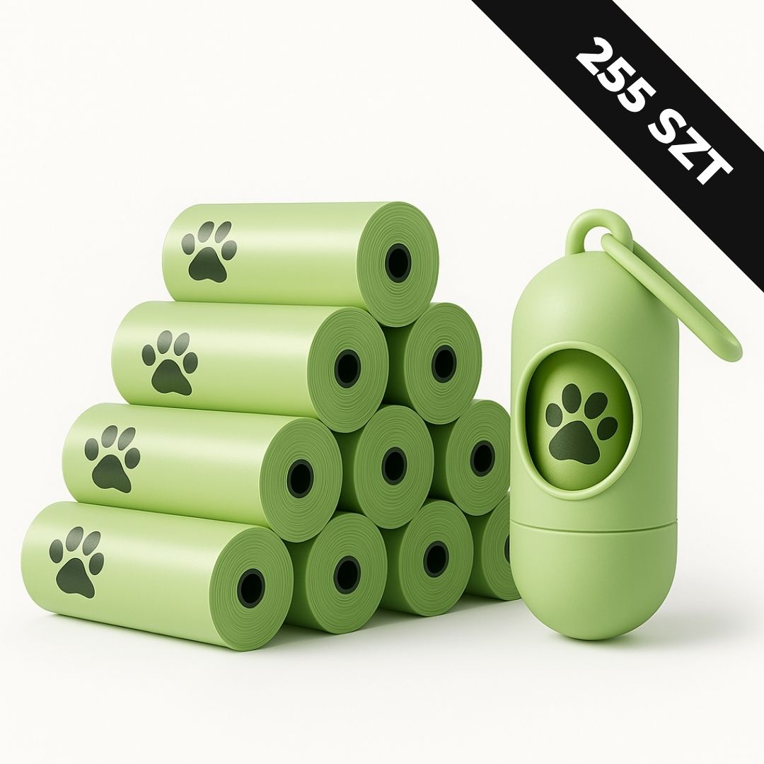 Praktyczny zestaw 255 biodegradowalnych worków na psie odchody z poręcznym podajnikiem. Idealny na spacery – wygodny, higieniczny i przyjazny dla środowiska.