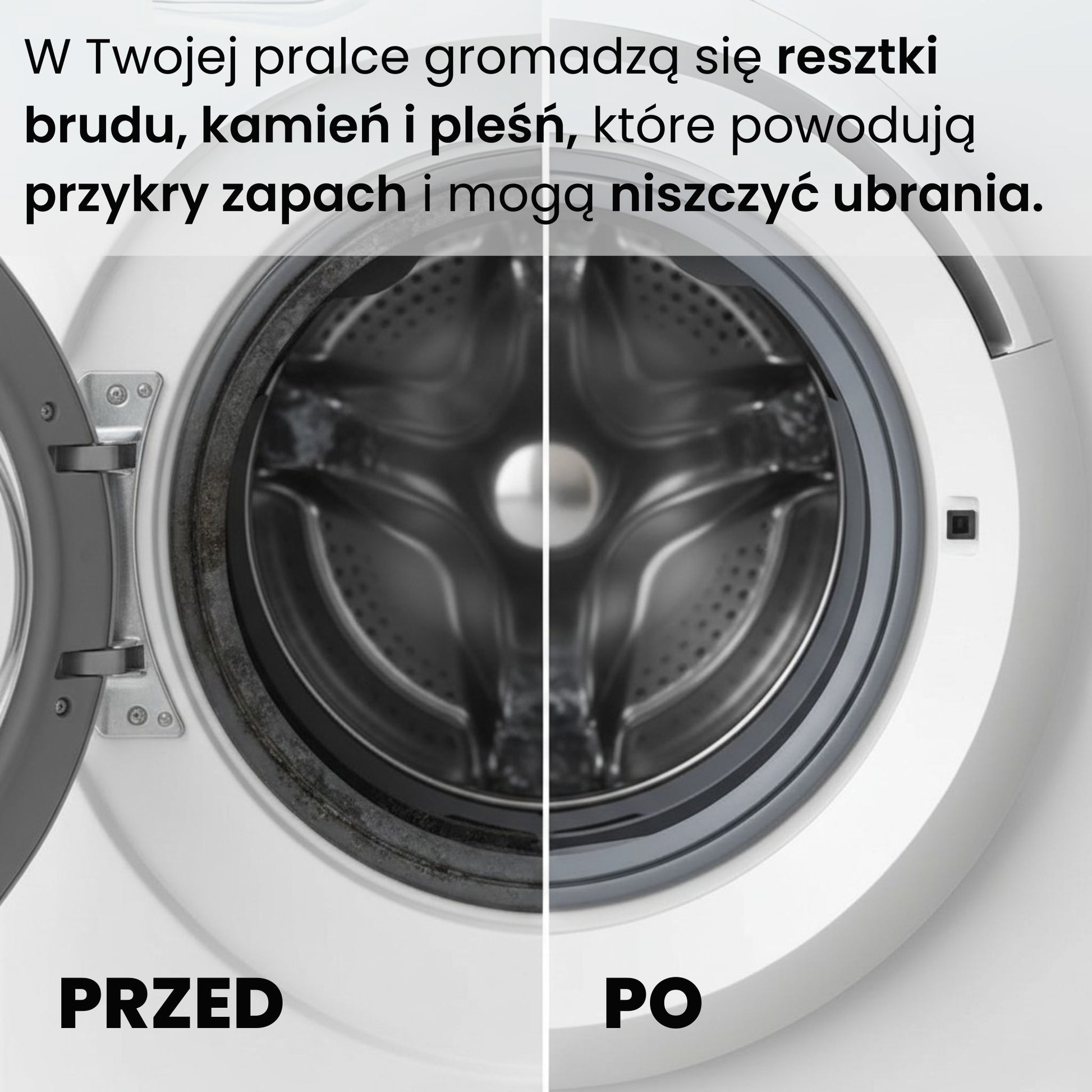 A dokładniej – brud, kamień i bakterie, które gromadzą się w jej wnętrzu i zamieniają urządzenie do prania w... siedlisko zarazków. Z każdym praniem problem się pogłębia, a Twoje ubrania – zamiast być czyste – wychodzą oblepione bakteriami i brzydko pachnące.