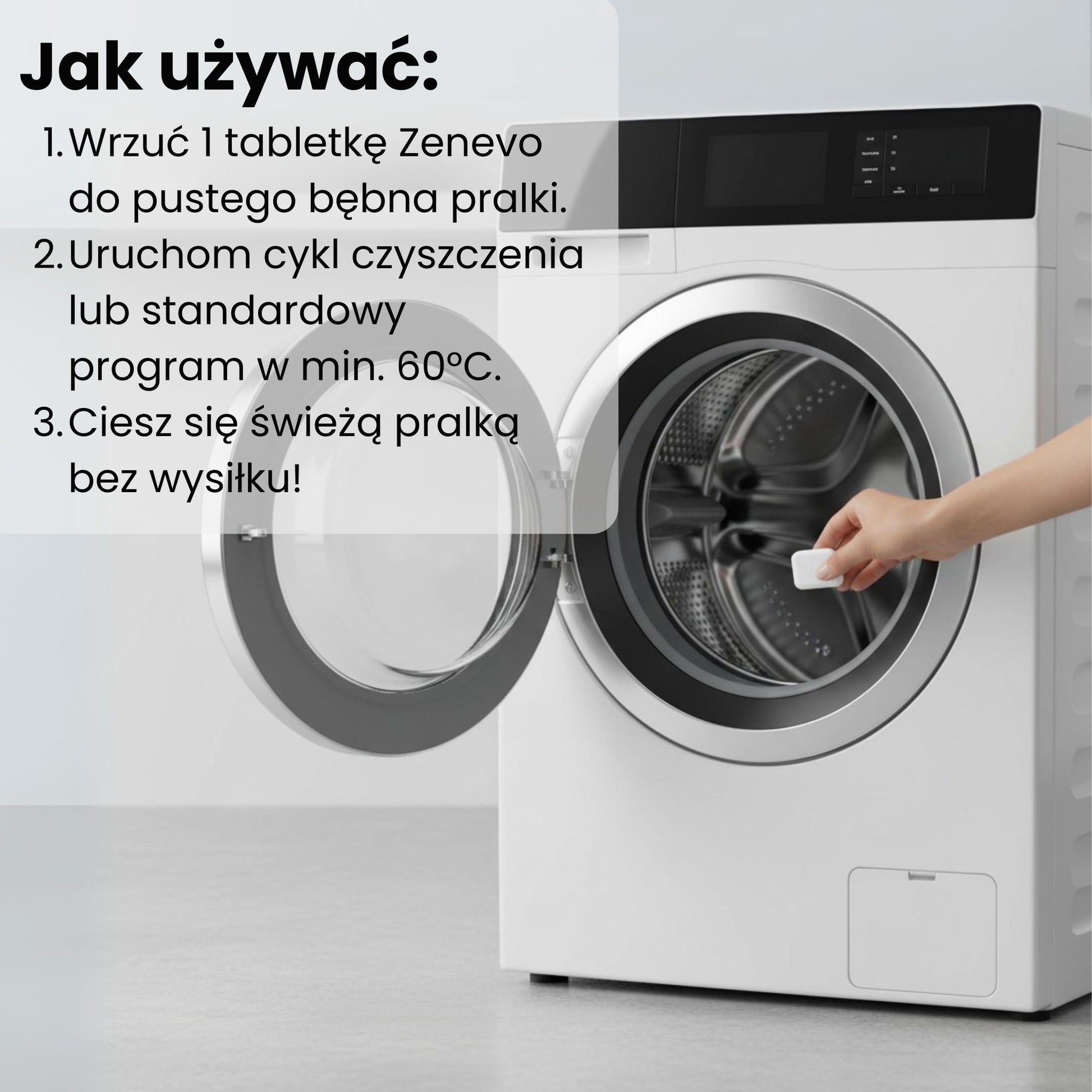 KROK 3: WŁĄCZASZ PRALKĘ Uruchom cykl. Aktywna formuła Zenevo zaczyna działać natychmiast – penetruje każdy zakamarek, rozpuszcza brud, rozbija kamień i niszczy bakterie w całym urządzeniu.